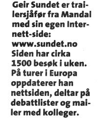 Nå er han sjef på Internett, Geirs nettside, Sundets Truckstop, er av Fævennen kåret til Sørlandets beste hjemmeside. Den har historier fra veien, artikler av Mao, utstrekningsøvelser for sjåfører, anbefalte forfattere, og innlegg om "verdens nest viktige motsetning, den mellom bites og atomer". Dessuten organiserer Geir'n e-postlister hvor sjåførene kan diskutere søvnproblemer eller skjelle ut politimesteren fra Stavanger. Han som i Tina-saken etterlyste en "trailersjåførtype": "Mann, stor, svær og robust kroppsbygning, tykk, mørkt og bustet hår med fall. ustelt, kort skjegg, lys hudfarge, men brun og frisk, sannsynligvis norsk."